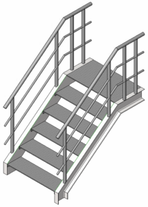 Steel staircase with a width of 1 m, designed to accommodate variable height differences. The steps maintain a 250 mm tread depth and a variable riser height depending on the total level difference to be overcome.